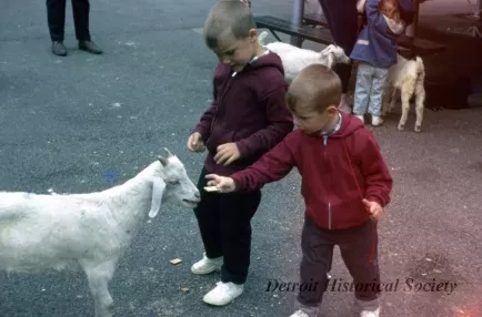 Request ImageDigital scan of a 35mm color slide of a photograph of two children from the Johnson family feeding a goat at the Belle Isle Children's Zoo.