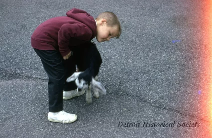 Digital scan of a 35mm color slide of a photograph of one child from the Johnson family with a young goat at the Belle Isle Children's Zoo.