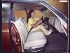 Color film negative of woman buckled in driver's seat as taken through the open passenger side door.