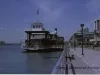 Negative and print of a color photo of the Lansdowne Restaurant docked at Hart Plaza. The LANSDOWNE was built in 1884 as a railroad car ferry. It was propelled by side paddlewheels and operated on the Detroit River. It was converted to a restaurant in the early 1980's. The Detroit River and Ambassador Bridge are visible in the left background. Portions of Cobo Arena, Cobo Hall, and the People Mover elevated track line are visible on the right side of the photo.