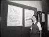 Monochromatic negative of a man standing before two posters made for a farewell party for Austin Bender in the Chevrolet Art and Chart department in the G.A. Richards Oakland Company Service Department for Oaklands and Pontiacs Building at 440 Burroughs Street. The posters read, "To You Austin, Good Fortune and Best of Health, Conditions which bring Joy and Contentment always, Dentler," and "Good Luck Bender, Sincerest Wishes from the Se[...]." The office's time clock is in the background, and it has been decorated with streamers and a sign that reads, "Happy New Year, Punch In Judy."