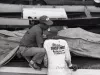 Black and white film negative of MISS THRIFTWAY taken during the 1956 Gold Cup Race on the Detroit River. Two crew members are covering the engine, probably because of rain that halted the running of heat 1B.