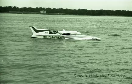 Black and white film negative of MISS THRIFTWAY at the 1963 Gold Cup Race. Driver Bill Muncey can be seen trying to restart his engine after being washed down by the roostertails of the other boats at the start. Flames can be seen coming from the engine. The Belle Isle shoreline can be seen in the background.