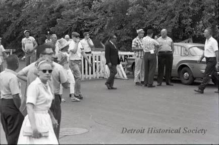 Black and white film negative of a group of spectators at the 1963 Gold Cup Race. The gentleman in the center of the picture, in the suit and tie, appears to be Guy Lombardo.
