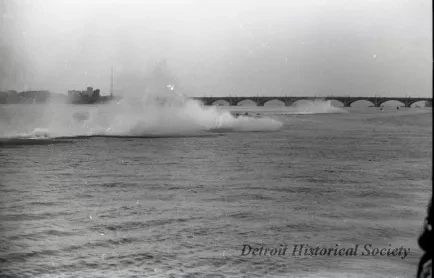 Black and white negative of two hydroplanes at speed, taken during the 1963 Gold Cup Race on the Detroit River. The Belle Isle Bridge can be seen in the background. The boat in the foreground is one of the two MISS U.S. entries, either MISS U.S. 1 or MISS U.S. 5.