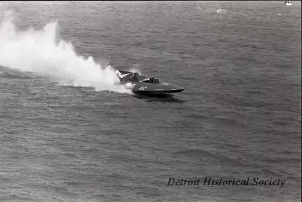 Black and white negative of MISS U.S. 5 taken during the final heat of the 1965 Spirit of Detroit Race on the Detroit River on August 29th. The boat was driven in that race by Roy Duby and finished fourth overall.