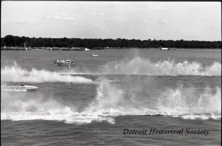 Black and white negative of the start of a heat from the 1965 Spirit of Detroit Race on the Detroit River. The boat at the left is SUCH CRUST IV. Ahead of her on her left is MISS MADISON. The roostertails of two other boats can be seen at the right. A course patrol boat can be seen in the background with the Belle Isle shoreline in the far background.