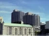 Negative and print of a color photo of the Millender Center with construction apparent on the lower levels of the Omni International Hotel tower. Taken from Hart Plaza with the Mariners' Church in the foreground.
