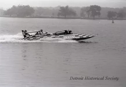 Black and white negative of MISS BARDAHL getting underway at the June running of the 1968 Gold Cup Race on the Detroit River. Driven by Bill Schumacher, she won the race in September after the June running was canceled because of weather and water conditions.