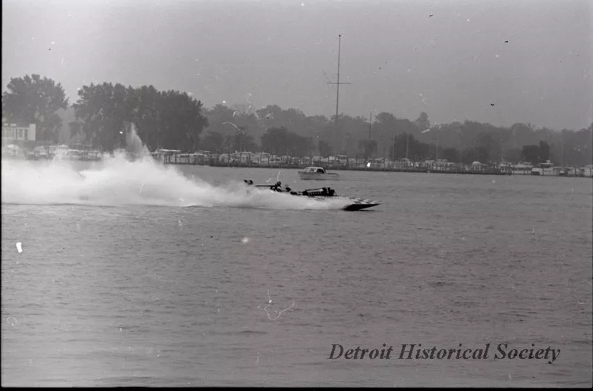 Black and white negative of MISS BARDAHL at the June running of the 1968 Gold Cup Race on the Detroit River. Driven by Bill Schumacher, she won the race in September after the June running was canceled because of weather and water conditions. The Detroit Yacht Club can be seen in the background.