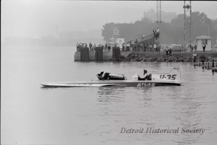 Black and white negative of ATLAS VAN LINES leaving the pits at the June running of the 1968 Gold Cup Race on the Detroit River. The driver is Jim McCormick. In the background are the grandstands at Waterworks Park. The race was cancelled and rescheduled for September.