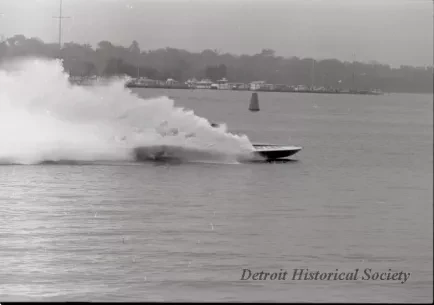 Black and white negative of ATLAS VAN LINES, obscured by her roostertail, at the June running of the 1968 Gold Cup Race on the Detroit River. The driver is Jim McCormick. The race was cancelled and rescheduled for September. The Detroit Yacht Club docks and Belle Isle shoreline can be seen in the background.