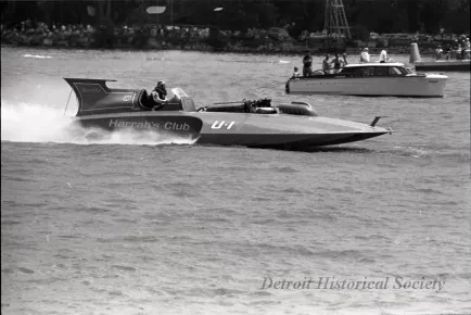 Black and white negative film taken at the 1967 World Championship Race on the Detroit River, of HARRAH'S CLUB, driven by Chuck Hickling. The boat finished tenth overall in the race.
