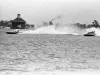 Black and white negative film taken at the 1967 World Championship Race on the Detroit River, of MISS CHRYSLER CREW (at left), driven by Bill Sterett, and HARRAH'S CLUB (at right), driven by Chuck Hickling, rounding the upper turn in heat 2A. The two boats finished first and second respectively in the heat.