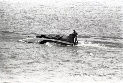 Black and white negative film taken at the 1967 World Championship Race on the Detroit River, of HARRAH'S CLUB, with driver Chuck Hickling standing near the transom, being towed back to the pits.