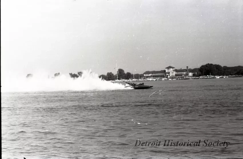Black and white negative film taken during the third heat of the 1959 Harmsworth Race on the Detroit River, of MAVERICK, driven by Bill Stead, who lost the heat to MISS SUPERTEST III.