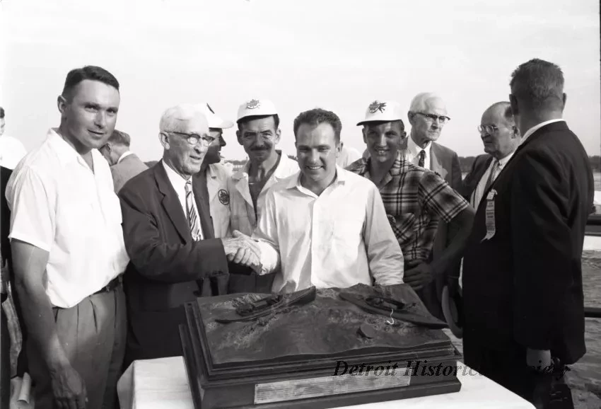 Black and white negative film taken after the 1959 Harmsworth Race of the trophy presentation. At left is winning MISS SUPERTEST III owner, Jim Thompson, and to his left is Gar Wood, congratulating driver Bob Hayward.