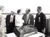Black and white negative film taken after the 1959 Harmsworth Race of the trophy presentation. From left to right are J. Gordon Thompson, owner of the winning boat, MISS SUPERTEST III, Gar Wood, MISS SUPERTEST III's driver, Bob Hayward, and two unidentified race officials congratulating Hayward. The Harmsworth Trophy is on the table in front of them.