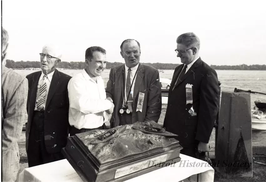 Black and white negative film taken after the 1959 Harmsworth Race of the trophy presentation. From left to right are J. Gordon Thompson, owner of the winning boat, MISS SUPERTEST III, with his back to the camera, Gar Wood, MISS SUPERTEST III's driver, Bob Hayward, and two unidentified race officials congratulating Hayward. The Harmsworth Trophy is on the table in front of them.