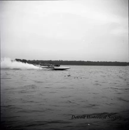 Black and white negative film taken during the third heat of the 1956 Harmsworth Race of SHANTY-I, driven by Russ Schleeh, coming down the front straightaway. The boat, which was the U.S. defender, won the heat and the race.