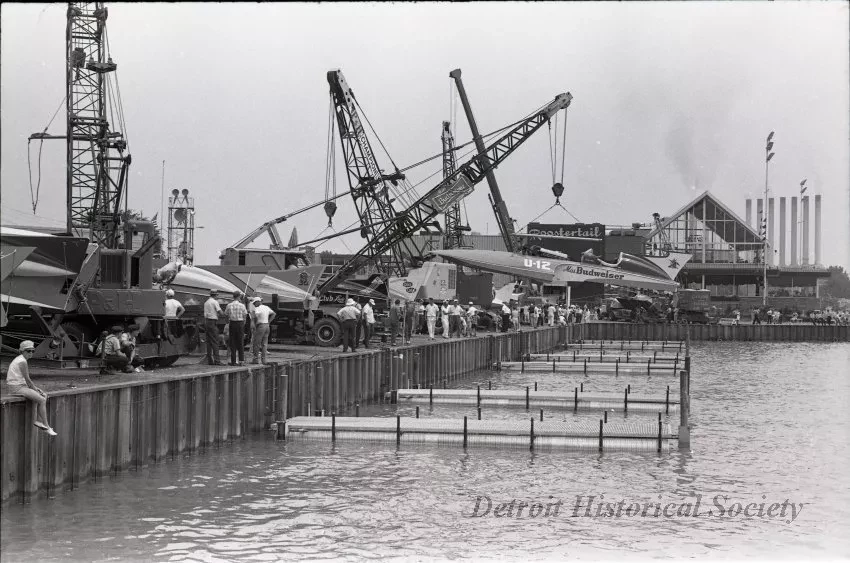 Black and white negative of the Horace Dodge Pits during the 1966 Gold Cup Races. MISS BUDWEISER is being loaded into the water. Tail fins of the boats visible, from left to right, include MARINER TOO, MISS LAPEER, $ BILL, THE LOANER, and WAYFARERS CLUB LADY.