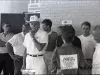 Black and white negative taken during the 1967 World Championship Race of the trophy presentations at the Horace Dodge Pit Tower. In the cowboy hat is Bob Espland, crew chief of the NOTRE DAME. Behind him over his right shoulder is Lee Schoenith, who is talking to Jim Ranger. At the far right is Bill Sterett, driver of MISS CHRYSLER CREW, who won the race.