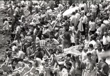 Black and white negative taken during the 1967 World Championship Race of the spectator crowd in the grandstands at the foot of Parkview Avenue, adjacent to the Gar Wood Judges Stand.