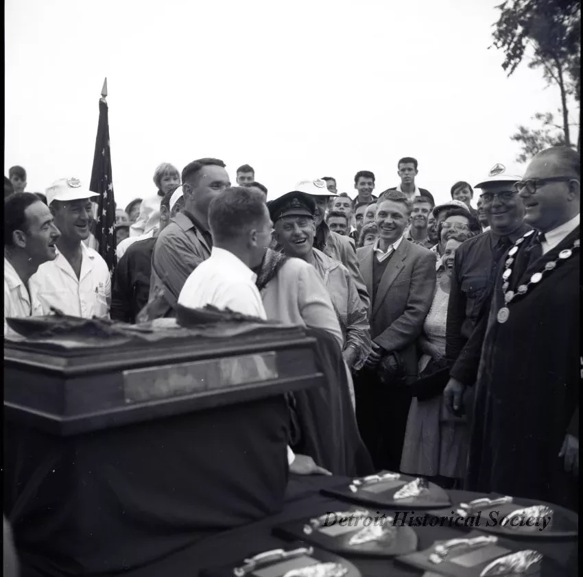 Black and white negative taken during the 1960 Harmsworth Race at Picton, Ontario, of the trophy presentation. Pictured in the white shirt is Bob Hayward, behind him is Jim Thompson, and to the far right is Picton Mayor Harvey McFarland. The Harmsworth Trophy is in the foreground.