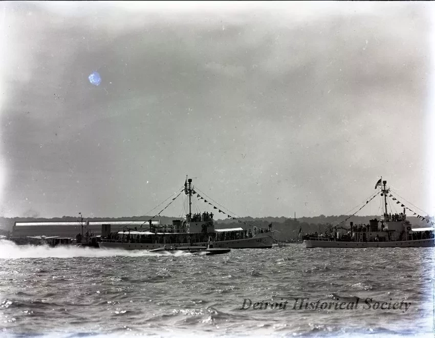 Black and white negative taken at the 1951 President's Cup Race on the Potomac River at Washington, D.C. Pictured is MISS PEPSI, driven by Chuck Thompson, who won the race. Behind him are two boats filled with spectators.