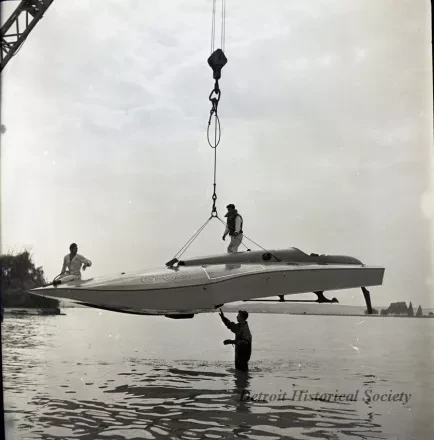 Black and white negative taken at the 1950 President's Cup Race on the Potomac River at Washington, D.C. Pictured is DEE JAY V, being lifted out of the water. Driver Norm Lauterbach, who finished seventh overall, is standing on the boat and a crew member is sitting on the bow.