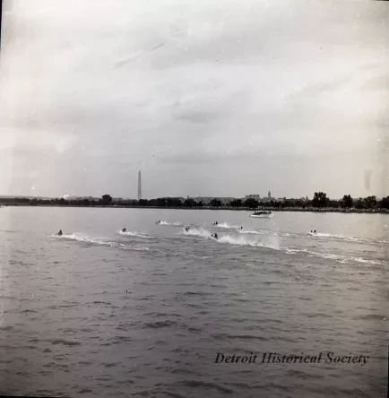 Black and white negative taken at the 1950 President's Cup Race on the Potomac River at Washington, D.C. Pictured are several small limited class boats, probably at the start of a heat. The Washington Monument can be seen in the background.