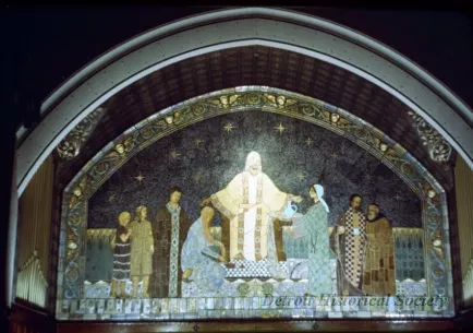 Color negative of the Pewabic mosaic, designed by Gwen Lux, a student of Mary Chase Perry Stratton, over the altar in Bethel Evangelical Church on West Grand Boulevard.