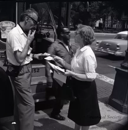 Third of a series of twelve black and white negative exposures of a Detroit Heritage Photography Workshop (DHPW) outing. The photograph captures a man handing money to a woman beside the door to a Department of Street Railways bus parked outside of the Detroit Historical Museum. The man has a camera around his neck and is smoking a cigarette whilst the woman is holding a clipboard. Behind them is a man that is getting off the bus. A Shedd's Peanut Butter advertisement is posted on the bus. In the background, Gutzon Borglum's bust of Abraham Lincoln is displayed on the grounds of the Detroit Institute of Arts.
