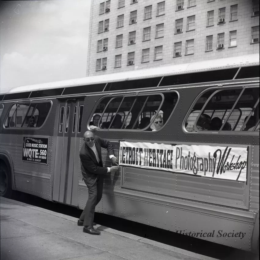 Fifth of a series of twelve black and white negative exposures of a Detroit Heritage Photography Workshop (DHPW) outing. The photograph captures Allan Stross taping down the "Detroit Heritage Photography Workshop" banner on the side of a Department of Street Railways bus parked on Woodward Avenue, in front of the Detroit Historical Museum. The bus is full with participants in the workshop. An advertisement that reads "The Good Music Station WQTE-560 AM RADIO, 6AM TO SUNSET" is also posted on the bus. The Park Shelton is visible in the background.