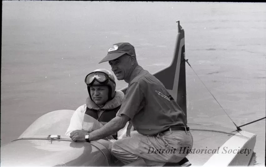 Black and white negative taken during the 1956 Gold Cup Race on the Detroit River of driver Bill Muncey in the cockpit of MISS THRIFTWAY preparing to go out on the race course. A crewman is squatting on the deck of the boat assisting him.