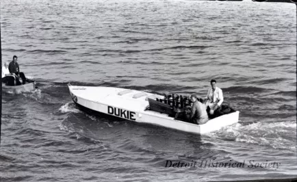 Black and white negative taken during the 1949 Gold Cup Race held on the Detroit River of DUKIE, (G-9), under tow, with the driver and his mechanic on board. Owned by Howard Hughes of Detroit, presumably one of the two figures in the boat, they failed to qualify for the race.