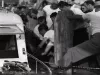 Black and white negative taken during the 1949 Gold Cup Race held on the Detroit River of a crowd of spectators looking down at something from the dock, which is unidentified.