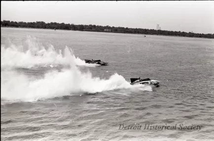 Black and white negative film taken during the 1967 World Championship Race on the Detroit River of U-99, MARINER TOO, driven by Fred Alter and U-11, MISS WICKMAN, driven by Red Loomis.