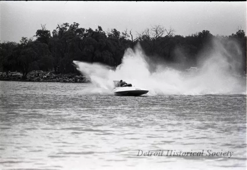 Black and white negative film taken during the 1967 World Championship Race on the Detroit River of NOTRE DAME, driven by Jim McCormick, rounding the upper turn. The boat finished fourth overall in the race. The spectator crowd on Belle Isle can be seen in the background.