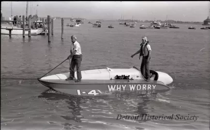 Black and white negative film of WHY WORRY (I-4) which was a contender in the 1939 Gold Cup Race on the Detroit River, being towed back to the dock. The man standing on the foredeck holding the tow line is driver Bill Cantrell.