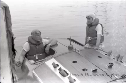 Black and white negative film of MERCURY at the dock on the Detroit River. The owner/driver is Marion Cooper (left), who drove the boat in the 1939 Gold Cup Race. His riding mechanic is on the right.