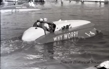 Black and white negative film of WHY WORRY, with driver Bill Cantrell and his mechanic, Jim Vetter, heading out onto the Detroit River during the 1939 Gold Cup Race. Another boat, BALD EAGLE, F-80, can be seen in the background.