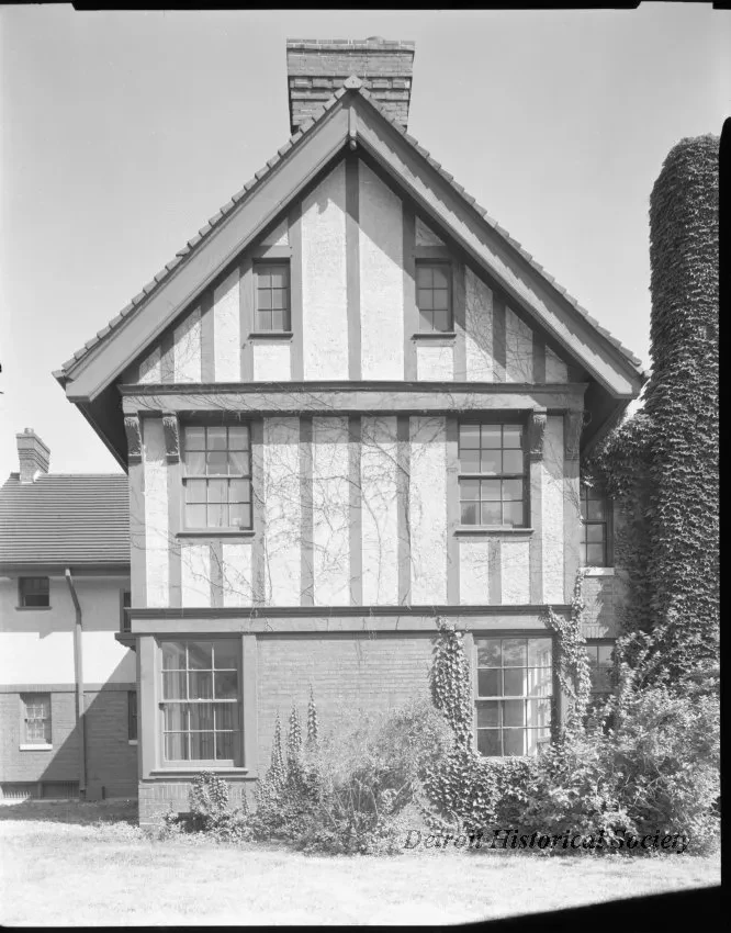 Black and white film negative of the half-timber and brick details of the Tudor Revival style Herman Strasburg House; also known as the Wayne State University Music Annex, located at 5415 Cass Avenue on the university's campus.