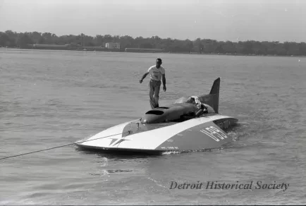 Black and white negative film taken at the 1963 Gold Cup Race, held July 7th on the Detroit River, of MARINER TOO under tow. Driver Fred Alter is standing on the deck. But the boat failed to qualify for the race. The Belle Isle bathhouse can be seen in the background.