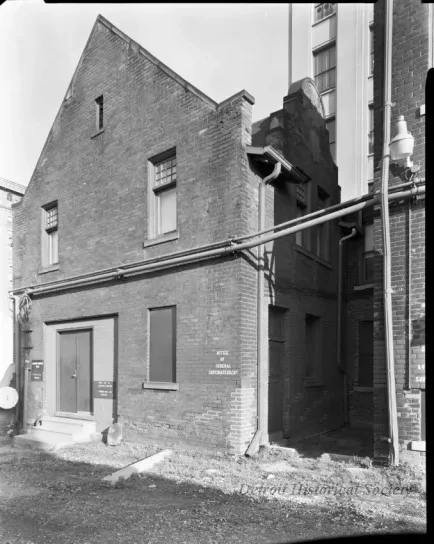Black and white film negative of the Smith House carriage house, located at 5035 Woodward Avenue, adjacent to the Maccabees Building. The original entryway has been replaced by double doors; and windows have been boarded up. Signage painted on the brick reads, "Office of General Superintendent." Also, signage affixed to the cinderblocks adjacent to the door reads, "This Lot is Assigned Parking; Others Will Be Ticketed."
