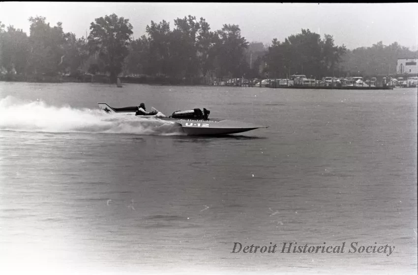 Black and white negative film taken during time trials on June 24th for the 1968 Gold Cup Race, to be held on June 30th on the Detroit River, of MISS BUDWEISER, driven by Bill Sterett. High winds forced postponement of the race until September 8th.