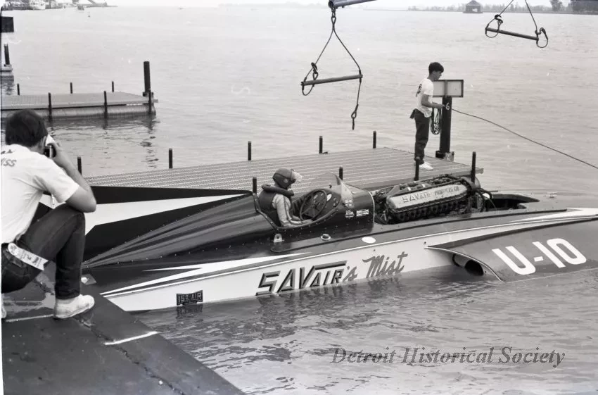 Black and white negative film taken during time trials on June 24th for the 1968 Gold Cup Race, to be held on June 30th on the Detroit River. The picture shows SAVAIR'S MIST, driven by Walter Kade, about to leave the pits.. High winds forced postponement of the race until September 8th.