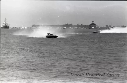 Black and white negative film taken on July 4th during the 1966 Gold Cup Race, on the Detroit River. The picture was probably taken during the final heat, which included both of the boats shown. $ BILL, driven by Norm Evans, is at left and MISS DIXI COLA, driven by Fred Alter is at right. They finished first and second respectively in the final heat.