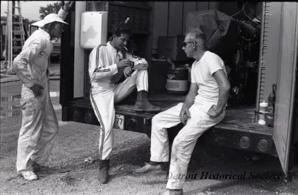 Black and white negative film taken on July 4th during the 1966 Gold Cup Race, on the Detroit River, of driver Jim Ranger, at center, with two of his crew members.