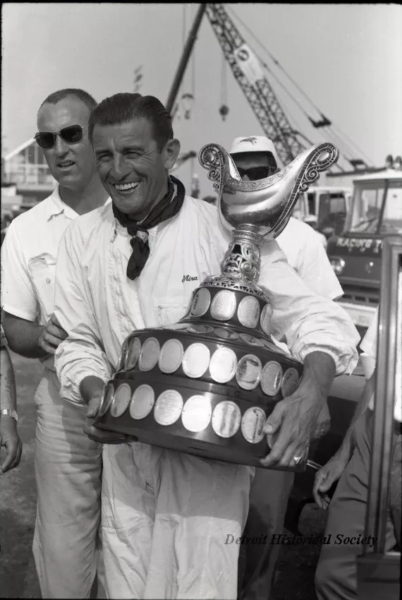 Black and white negative film taken on July 4th during the 1966 Gold Cup Race, on the Detroit River, of Mira Slovak, driver of the Gold Cup winner, TAHOE MISS, holding the Gold Cup trophy.